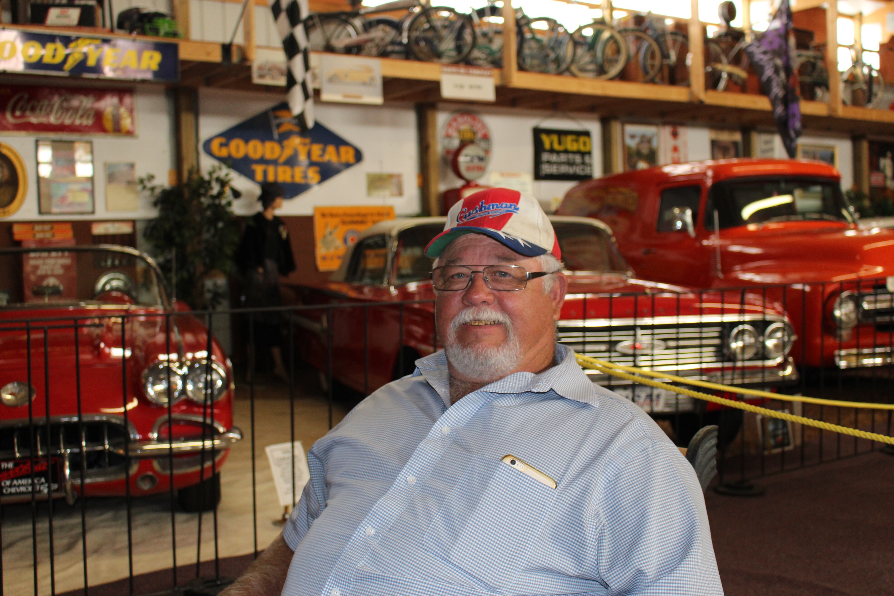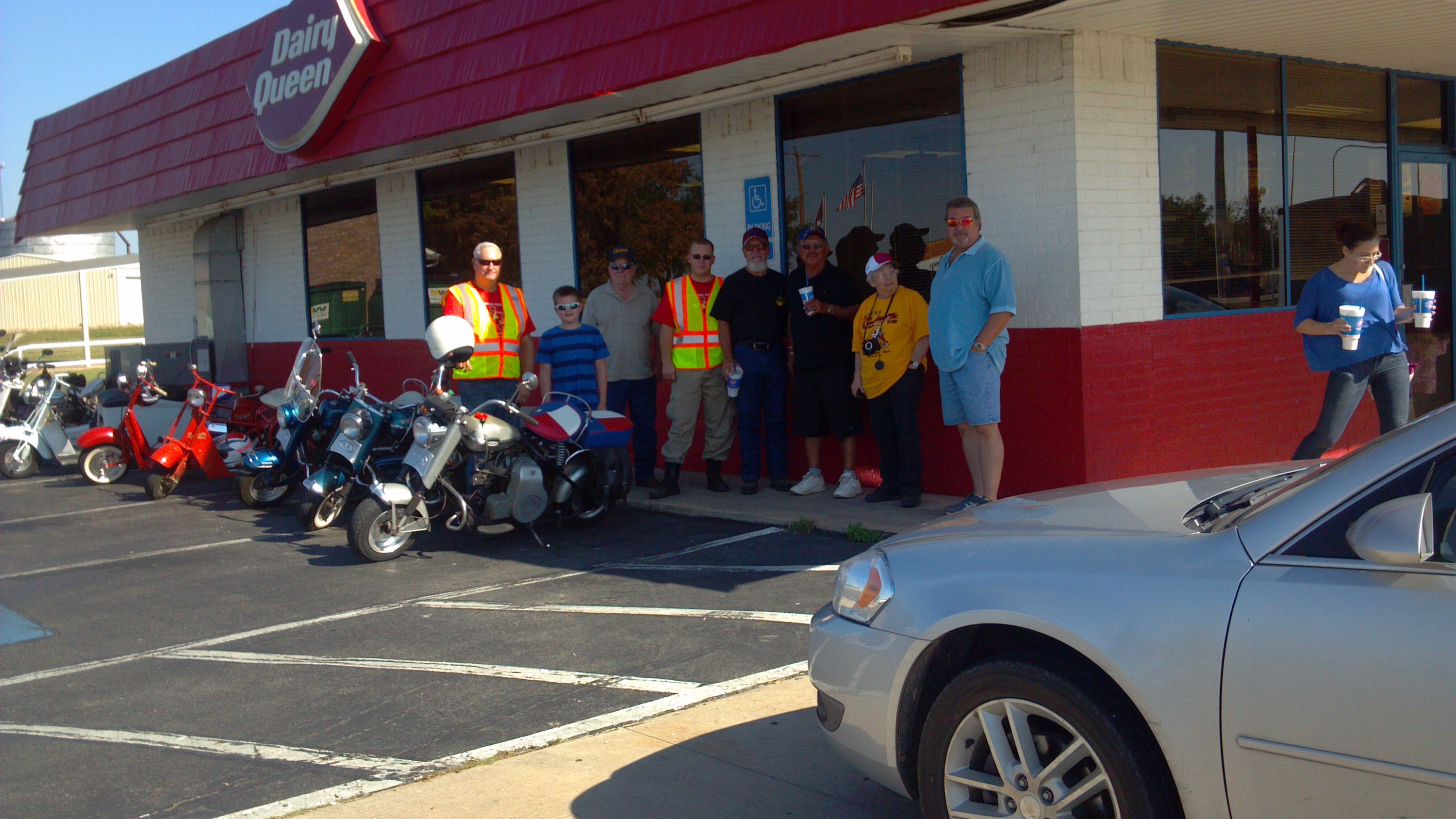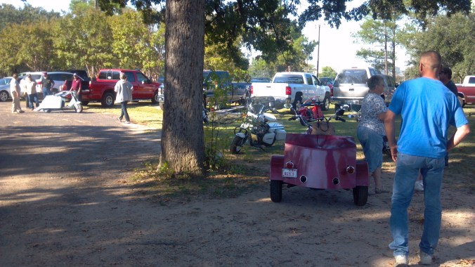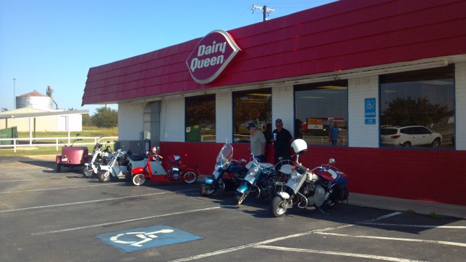 In October 2014 approximately twenty men and women were present to participate in the annual Sulphur Springs (SS) Cushman Slow Ride. After a couple of hours of meeting, greeting, and discussing individual Cushman past and present projects, we filled our bellies with Hopkins County Stew, cheese, and crackers to strengthen us for the ride. The stew was topped off with Ceil Blount’s wonderful brownies. Eleven hard core Cushman riders decided it was time. We headed out to the back roads to Cooper and Cooper Lake. We had planned to indulge ourselves at Millers Drug Store ( old Ice cream/ Malt shop) in Cooper but had to settle for some Dairy Queen Ice Cream instead. Millers Drug has been in existence since the 30’s. It’s truly a land mark with soda fountain, tables , malts, floats, and Purple Cows. The return trip to SS included a tour of Cooper Lake and different country side landscapes. The route back also included a ride through downtown SS to view the remaining Corvette exhibit that was on display before returning to Coleman Park.