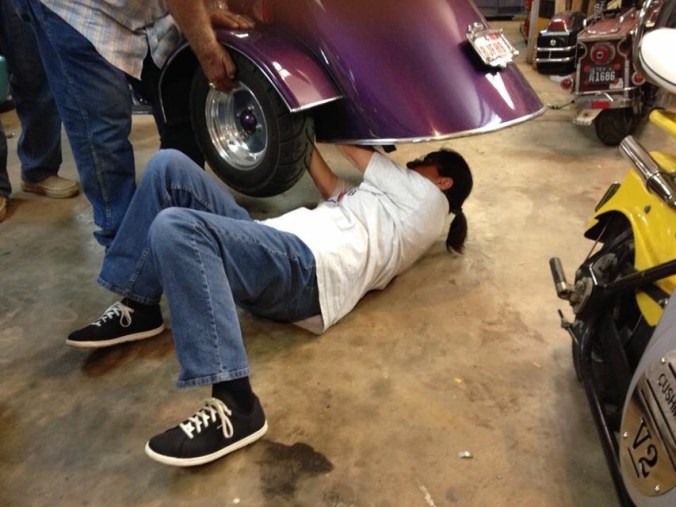 Here I am working with Raymond on my trike. Photo by Zoe Branch