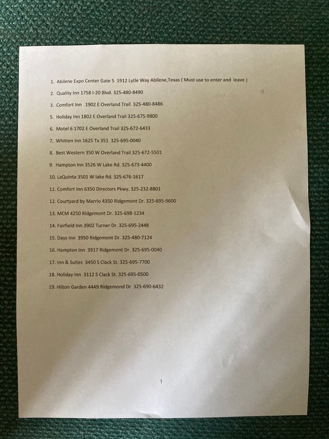 Hotel list for Abilene State Meet 2021 August 4, 2021August 4, 2021 / texascushmaneditor Thanks, Jack Miller . Share this: Click to share on X (Opens in new window) X Click to share on Facebook (Opens in new window) Facebook Like Loading... Related