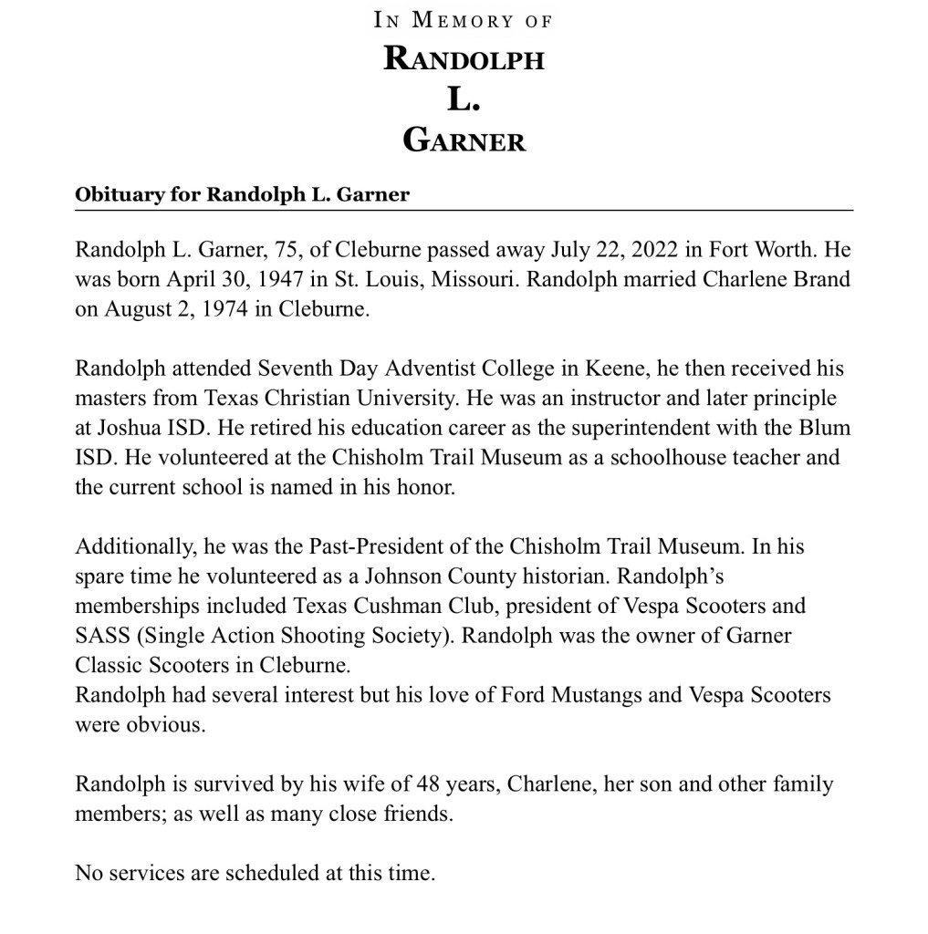 Randolph Garner was the first president of the Texas Cushman Club (1982-1987) and lived in Cleburne, TX. He along with the other Charter Members created a club for the enjoyment of riding Cushman scooters.