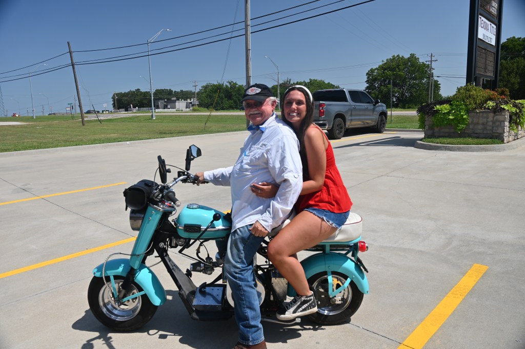 From the museum, everyone went to Pixie Dust Ice Cream and Gift Shop in Lone Grove. The cold ice cream and air conditioner were welcomed after riding from Gene Autry, and riders got special treatment because the shop owners are friends of the Hudson’s. The scooters were a hit with the younger people who worked there because they had never seen a Cushman. Dane Marable had a buddy seat and he enjoyed giving rides around the parking lot to some of the girls who worked at Pixie Dust. It was said that many of the guys were wishing they had had a buddy seat also so they could give rides! Thanks goes to Lori and Brandon Smith for the accommodating our group. Lori really would like to own her own Cushman Eagle…one day.