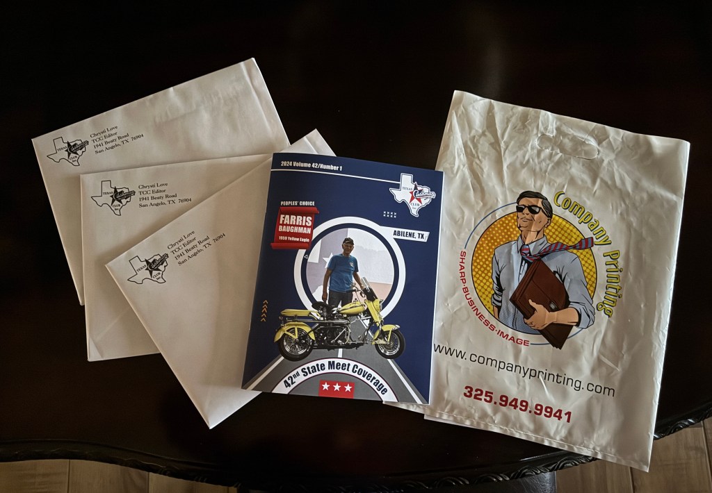 Members will be receiving one of 183 magazines we mailed today, December 12, 2024. I hope you enjoy reliving a great meet in Abilene and mark your calendars for the scheduled rides in 2025. Chrysti Love, Editor